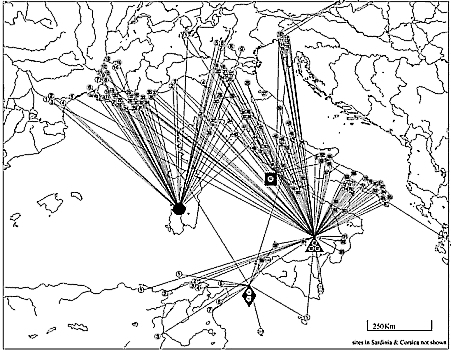 Distribution of obsidian from the four western Mediterranean sources during the Neolithic period